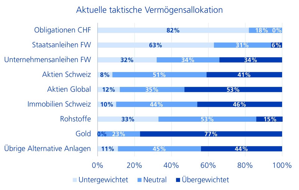 Realwerte wie Gold, Aktien und Immobilien sind deutlich stärker gefragt als Obligationen. Gerade beim Gold ist aber die Meinung in einem solchen Masse einstimmig, dass die Preissteigerung ein Warnsignal sein könnte. Die allgemeine Stimmung unter den CIOs ist optimistisch, jedoch nicht übertrieben euphorisch.