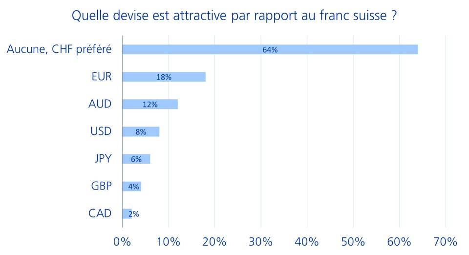 Bien que la préférence marquée pour le franc suisse nous amène logiquement à conclure que les risques de change devraient être couverts pour les mois à venir, l'enquête montre étonnamment que seule une minorité des répondants (14%) prévoit d'augmenter leur couverture des devises. Une explication possible réside probablement dans les coûts de couverture encore élevés, atteignant par exemple 3% dans le cas du dollar américain.